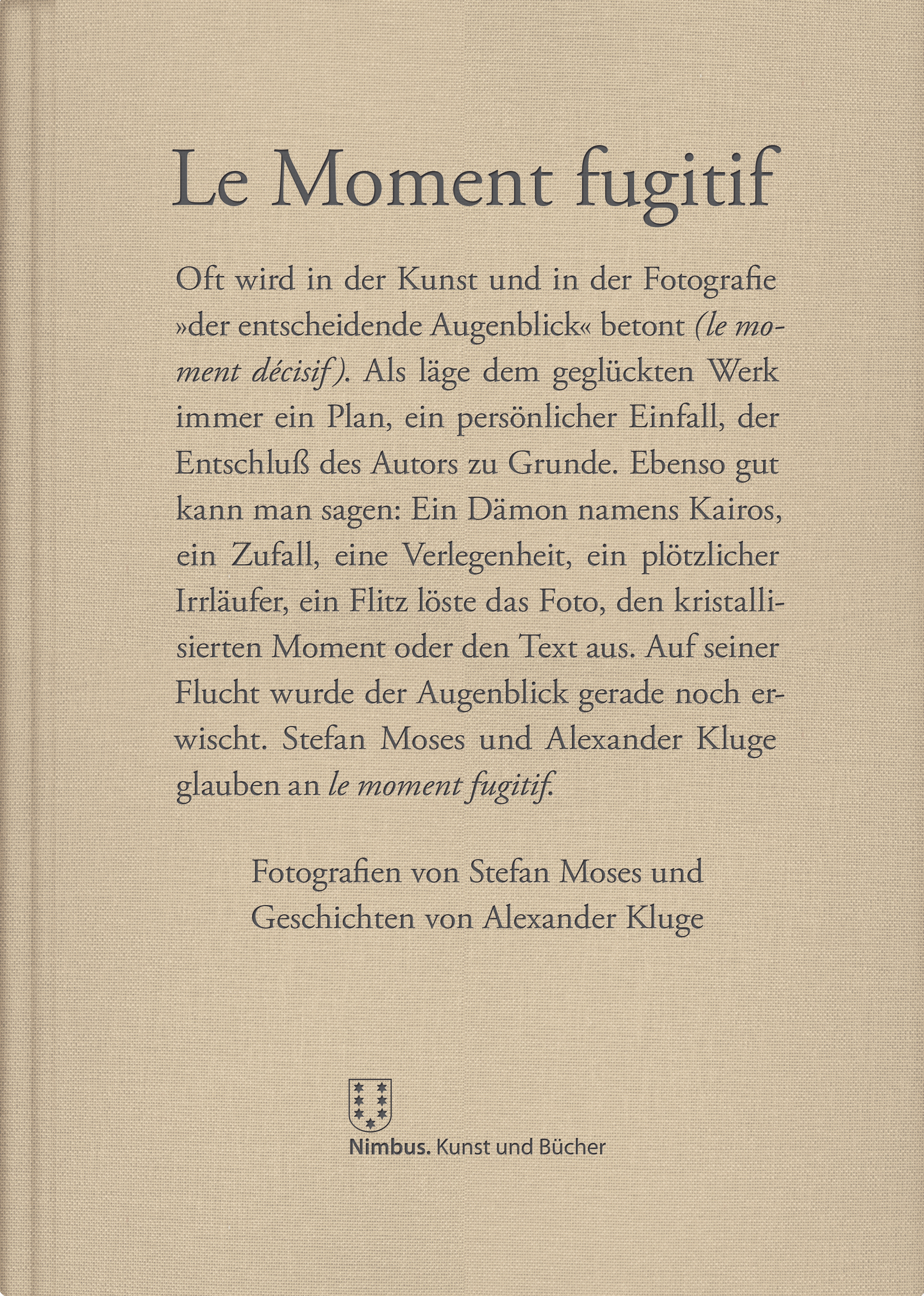Le Moment fugitif ist ein großformatiger Band, der 33 unbekannte Texte von Alexander Kluge mit 85 Fotos von Stefan Moses kombiniert. Die Kombination dieses Buches ist ungewöhnlich und verdankt sich einem Zufall: Stefan Moses und Alexander Kluge sind Nachbarn. Ihre Begegnungen waren sporadischer Natur, bis sie merkten, daß ein gemeinsames Thema sie beschäftigt: Welche Momente für sie besonders sprechend sind – für den Fotografen einerseits und den Autor und Filmer andererseits. Seit Cartier-Bresson gilt das Erfassen des «moment décicif» als das Kriterium fotografischen Gelingens. Für Moses und Kluge ist dieses Denken einseitig: Es leistet dem Ausblenden Vorschub. Moses denkt seit je in Serien und gestaltet seine Motive gerne als Triptychon. Diese Sequenzen hat Kluge als Inspirationsquelle zu eigenen Geschichten aufgenommen, die teils thematisch von den Bildern ausgehen, andernteils den Evokationen folgen, die deren Umkreis entstammen. Entstanden sind so 33 Texte, die in einem changierenden Verhältnis von Koinzidenz und Inkongruenz zu Moses’ Fotos stehen. Kluge erzählt darin von Menschen in politischen und privaten Umbruchsituationen, wo der Überblick schwindet und das große Improvisieren beginnt: SED-Kader in den Tagen der «Wende», die sich plötzlich ohne Führung in einem neuen Koordinatensystem der Kräfte wiederfinden; Stasi-Leute, die unschlüssig schwankend zwischen den Optionen Untergrund und Anpassung stehen; Gregor Gysi, der nach seiner Wahl zum PDS-Vorsitzenden sich nachts im verwaisten Büro des einstigen SED-Vorsitzenden wiederfindet und keine Ahnung hat, mit welchen Entscheidungsträgern ihn das Bataillon blinkender Telefone auf dem Schreibtisch verbinden könnte. Eine sitzengelassene Ehefrau, die nach der Fall der Mauer mit Kind und Kegel bei ihrem nach Westen entwichenen Ehemann aufkreuzt. Das Spektrum der Protagonisten reicht vom einfachen Bürger bis zu Politikern in den Zentren der Macht, unter ihnen Helmut Schmidt, Jimmy Carter und Konrad Adenauer. So unterschiedlich sie mit Entscheidungssituationen umgehen – das Moment der Hilflosigkeit begegnet – zumindest flüchtig – allen.